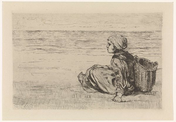 Curator: Jozef Israëls’ mixed media artwork, dating roughly from 1834 to 1911, shows a woman and child walking along a beach. Editor: It's so muted; a palette of greys and browns dominates. Immediately, there is a certain melancholic tonality to it. It reminds me of photographs from that period, desaturated. Curator: Absolutely. The composition leads your eye deliberately. Observe the horizon line—it bisects the work, setting up a contrast. The upper register, filled with diffused light, plays against the textured sand. The figures aren’t centered, creating imbalance, but this emphasizes their relationship. Editor: You're right, the symbolism lies heavily with those figures. The mother carrying what looks like a heavy basket – we instinctively associate this with labour, perhaps the fruits of the sea or goods to trade. This symbolizes toil and dependence. Curator: And consider their garb. We can read them immediately as part of a working class, tied closely to the ocean as source and, undeniably, threat. Their downturned gazes add a narrative dimension. Where are they headed? What’s in the basket? Editor: Perhaps Israëls is channeling a broader anxiety. Images of fishermen and rural poverty were ubiquitous, especially during periods of economic downturn. These figures visually encapsulate those tensions between man, nature, and survival. I see parallels with Millet’s depictions of peasant life. Curator: Certainly. The rendering adds further complexity, right? Israëls doesn’t meticulously define every aspect. The forms are suggested rather than rigidly delineated, the material is indeterminate - the blending of charcoal, watercolour, and chalk leads to further softening, inviting subjective experience. Editor: It makes one consider what the sea represents as a cultural archetype. Life, opportunity, sustenance but also potential oblivion. Perhaps this woman trudging forward represents a collective endurance against all odds. Curator: Precisely. Through Israëls' technical handling of light, material, and subject, the universal resonates. Editor: Indeed, a deceptively simple composition bearing weighty significance.