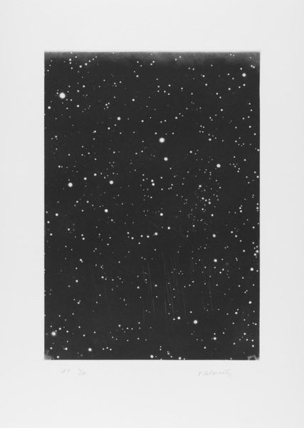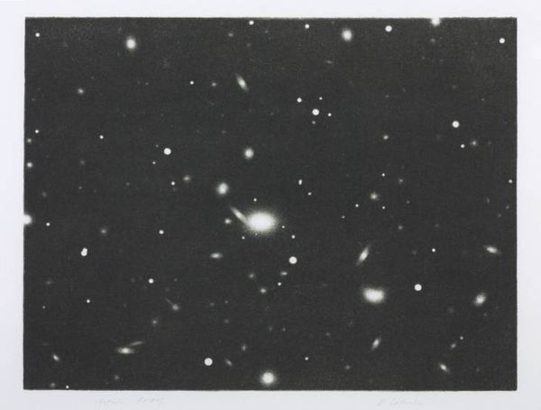 Gerhard Richter created "Sternbild" with oil on canvas. The painting presents an enveloping expanse of black, punctuated by subtle constellations of grey and white spots. This monochrome scheme evokes a sense of infinity, mirroring the cosmos. The visual structure hinges on a play between control and chance. Richter's precise application of paint creates the illusion of depth, while the blurred edges and diffused light suggest an almost photographic quality. We see him engaging with the concept of the readymade, challenging our perceptions of reality and representation. The composition destabilizes fixed meanings through the semiotic system of signs. Does it represent existential themes, or an exploration of perception? Richter invites us to question the boundaries between abstraction and figuration, reflecting poststructuralist thought. He prompts us to reconsider how we interpret images in an age saturated with them, emphasizing that art is an ongoing dialogue rather than a definitive statement.