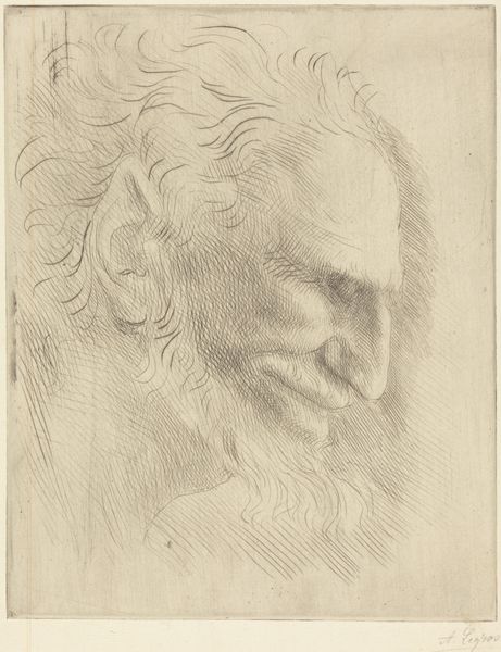 Curator: Here we have Alphonse Legros’ “Head of Souliote,” an etching rendered in incredibly fine lines. Editor: It has such a solemn presence. The meticulous linework and subtle shading give the portrait an almost photographic quality, despite being an etching. A timeless man, a timeless piece. Curator: Legros, active in the realist movement, was deeply engaged with representing working-class figures and scenes. There's a school of thought suggesting the 'Souliote' might symbolize resilience in the face of adversity, resonating with contemporary socio-political issues. Editor: The name 'Souliote' makes me wonder about its cultural roots. The profile, especially that strong nose and the flowing beard, suggests a wisdom born of experience. The beard itself— a very patriarchal symbol, indicates profound maturity, knowledge possibly passed through generations. Curator: Interesting point. There is little concrete data surrounding the genesis of "Head of Souliote," as Legros did not include notes with most of his pieces. However, what cannot be argued is Legros' printmaking process allowed for greater access to art for the burgeoning middle classes in the 19th century. Editor: And looking at it today, the accessibility translates to a striking immediacy. The detailed rendering makes him feel not distant, but present. You can imagine this man's voice, his stories. What visual narratives the beard must be able to tell! Curator: Absolutely. Prints like these served a crucial role in disseminating images and ideas, shaping public opinion, and influencing social reform, bringing art outside of the bourgeois. It shows us art has always been in conversation with sociopolitical realities. Editor: To me, "Head of Souliote" transcends any singular moment or movement. The work explores an ancient ideal—the philosopher king, the timeless patriarch, rendered with a careful eye. Curator: Ultimately, whether a political statement or a universal ideal, this work speaks to the enduring power of portraiture and the capacity of art to hold a mirror to society. Editor: Yes, regardless of time, "Head of Souliote" resonates with the human condition—its struggles, its dignity, and its enduring quest for meaning.