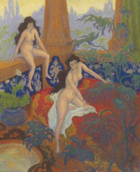 Editor: This "Untitled" painting by Paul Ranson is really intriguing. The use of tempera gives it a matte finish, and I'm drawn to the dreamlike quality it evokes. It feels almost like a stage set. What strikes you most about this piece? Curator: Considering its Symbolist and Art Nouveau leanings, I find the construction of gender and performance to be especially potent. Look at the passive, reclining figure versus the upright one adorned with stylized panthers – how might contemporary audiences have read these roles, and what social anxieties might they reflect about women's changing positions in society? Ranson was a member of the Nabis, a group of artists very interested in exploring spiritualism, and the relationship between design and fine art. What could the presence of the dogs signify? Editor: That’s a great point about societal expectations. The dogs almost seem like attributes, symbols of fidelity and the wild or untamed, connected to the figures. Given his artistic influences, do you think Ranson consciously included these gendered and animalistic symbols, aware of how the public might react? Curator: Absolutely. The Nabis artists engaged with redefining the aesthetic and philosophical purpose of art. These artistic circles consciously explored these themes, attempting to push the boundaries of what was acceptable. This 'scene' plays on a range of coded signals, pushing the viewers to piece it together themselves. It suggests the interior, psychological worlds that interested so many artists in this period. The lack of traditional perspective also contributes to this sense of theatrical, constructed space. Editor: I've never considered the social and political messages conveyed through "naive art", thanks for expanding my perspective on this work! Curator: Likewise, looking at it again, I notice how its deliberate theatricality continues to speak to audiences even today.