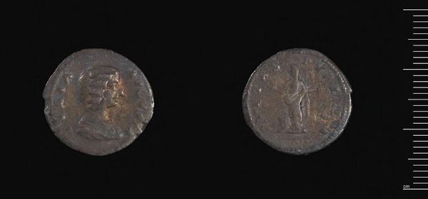 Editor: This is a sestertius – a Roman coin – of Faustina II. It's pretty weathered, but it has a certain gravitas, a sense of history worn right into its surface. What's the story this coin whispers to you? Curator: Ah, whispers of power, Editor! Imagine, holding a portrait touched by countless hands, a direct link to an Empress. Coins were early mass media, projecting imperial authority. What do you make of her gaze? Editor: It’s… serious. Distant, maybe? Curator: Exactly! This wasn’t about capturing a likeness, but projecting an image. Symbols mattered more than subtlety. Every detail was carefully crafted. Don't you find that fascinating? Editor: Definitely something to think about next time I'm using spare change! Curator: Indeed! These small objects carry immense weight, if only we learn to listen.