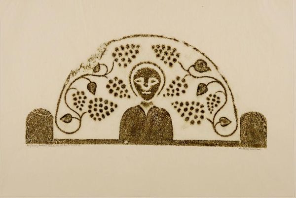 Editor: Ann Parker's "Polly Coombes, Bellingham, Massachusetts, 1795" presents such a curious figure. The symmetry is striking, but it’s also a bit unsettling. What visual echoes do you see in this image? Curator: It's fascinating how Parker combines seemingly disparate visual languages. The stylized hair evokes classical motifs, yet the face itself has a folk art simplicity. Do you see how the large eyes draw you in, almost like an icon? This interplay reveals layers of cultural memory. Editor: I do. It feels almost like a protective emblem. Curator: Exactly. Consider the cultural landscape of 1795 Massachusetts. What symbols might have offered comfort or conveyed status? This image acts as a vessel, carrying these hopes through time. Editor: I hadn’t thought of it as a vessel before. Curator: These enduring symbols truly shape our understanding of the past. Editor: I'll remember that. Thanks!