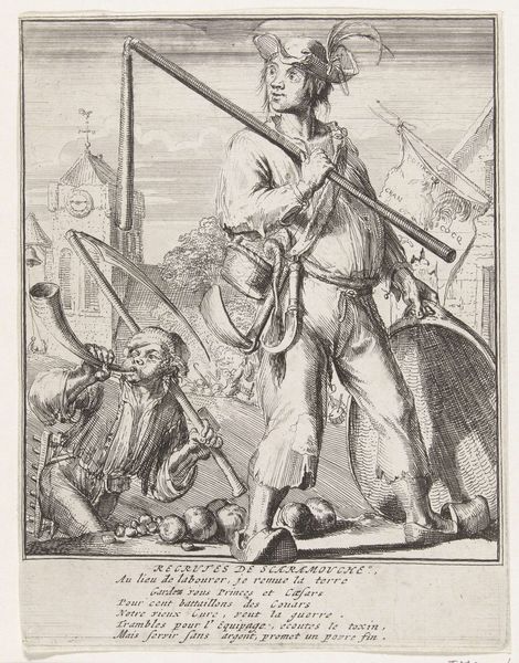 This is Heinrich Aldegrever’s “Vaandeldrager”, made around 1540. The print captures our attention with its intricate detail and the imposing figure at its center. The composition is dominated by the standard-bearer himself. Aldegrever employs a dense network of lines to articulate the textures of fabric, metal, and flesh, bringing a tactile quality to the two-dimensional surface. The standard-bearer’s stance, framed against the backdrop of a serene landscape, hints at the complex interplay between individual identity and communal allegiance characteristic of the Renaissance. The formal precision with which Aldegrever renders each element is a reflection of the broader intellectual currents of the time, where a renewed emphasis on empirical observation and rational inquiry shaped artistic practices. The artwork invites us to consider how the formal elements contribute to the construction of meaning. It reminds us that art serves not only as a mirror of its time but also as a lens through which we can examine the enduring questions of human existence.