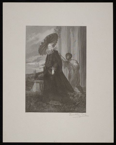 Curator: Looking at this work by Timothy Cole from 1909, a wood-engraving titled "Marie Leszczinska," currently held at the Minneapolis Institute of Art, the first thing that strikes me is the intricate detail for such a graphic medium. Editor: Yes, that’s exactly what hit me too – it’s an exceptionally rendered portrait, seemingly of immense opulence and formality, yet somehow rendered in very stark, grayscale tones, which almost deflates its presumed grandiosity. I see an almost eerie flatness. Curator: I see the austerity as deliberate, Cole operating within a well-established system. Consider the period – early 20th century – where the woodcut, after a decline, experienced a resurgence thanks to the Arts and Crafts movement, and how that re-emergence challenged established artistic norms and provided platforms to various underrepresented individuals within visual arts. The choice of a woodcut suggests a potential democratizing of representation, of access. Editor: An interesting perspective. I would add the subject reinforces its accessibility– or lack thereof! Marie Leszczinska was Queen of France, wife of Louis XV. This presents the unavoidable conversation about power, privilege, and perhaps, in this particular moment of artistic creation, a reconsideration of inherited systems of inequality. I can't help but wonder how Cole grapples with class disparity via the graphic image. Curator: Certainly. The original portrait source will provide its own layers of meaning – What narratives about Marie did it circulate, what function did it play? However, I feel Cole consciously brings awareness to bear regarding institutional roles around visual art production as gatekeepers of public memory, which could invite a further unpacking about identity formation within gendered frameworks, especially female identity constrained by monarchical expectation. Editor: I agree that the reinterpretation carries a lot of weight. I keep coming back to the details: The almost gothic quality in the drape of fabric, even that tiny dog at the Queen's feet–each facet seems to hint at a wider set of class relations embedded in systems of oppression and cultural values of the time. I would like to explore that historical portraiture and contemporary power dynamics as expressed and re-translated in visual culture. Curator: A powerful work, indeed. Editor: A potent reminder of the visual legacy that binds and sometimes blinds us.