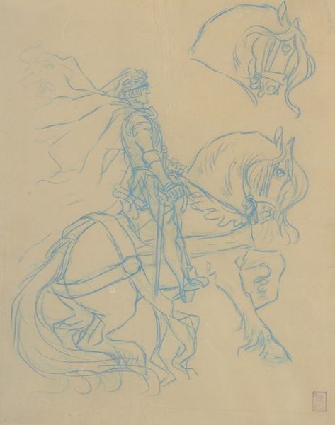 Editor: This compelling drawing, "Knight in a Battle," rendered in ink and chalk on paper by Victor Müller, depicts a chaotic scene. A woman offers the knight what appears to be a dead child! It’s incredibly unsettling. What's your read on it? Curator: This piece reflects a broader cultural obsession with heroism and tragedy prevalent in 19th-century Romanticism. Think about the socio-political climate: growing nationalism intertwined with anxieties about war and loss. The idealized, yet vulnerable knight embodies those tensions. How do you see the presentation of the woman impacting our interpretation? Editor: Well, her being laurel-wreathed, almost like a Fury from mythology, suggests that war isn’t glorious – it's devastating. The dead child becomes a potent symbol of that cost. Is the museum context itself shaping my view too much? Curator: Museums absolutely frame how we understand art. In this case, placing it within a collection of Romantic-era drawings emphasizes its engagement with historical narratives and emotional intensity, arguably valorising themes of national sacrifice, or pointing to its futility, doesn’t it? How do you perceive its relevance today? Editor: Now that I think of it, that tragic narrative of endless conflicts and loss continues even now. Curator: Precisely. And Müller's choice of medium—drawing—lends an immediacy and vulnerability to a grand historical theme. It's less about celebrating victory and more about contemplating its human cost, something art can bring to the forefront. Editor: It's like the artist anticipated the enduring political impact it can bring by sharing the human tragedy of it all. It will be a moment before I forget about this dark image. Curator: And that is exactly what allows such pieces to continue contributing to societal discussions across centuries. Art makes you feel before it makes you think, hopefully urging some form of progress as we reflect on its history.