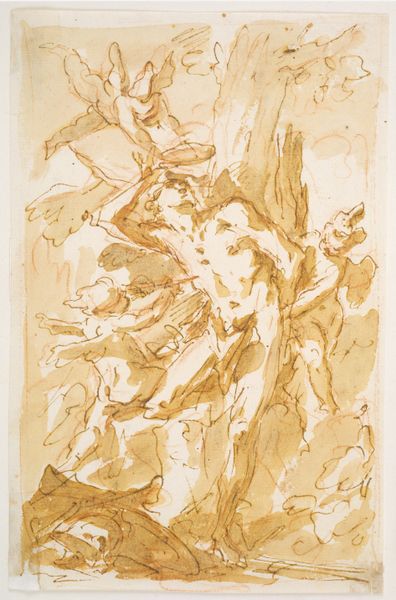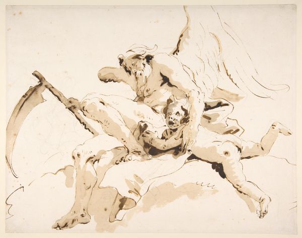 Giovanni Battista Tiepolo made this drawing of a seated river god, nymph with an oar, and putto using pen and brown ink with brown wash over graphite. Tiepolo's mastery is evident in the way he coaxes form out of simple materials. Brown ink, applied with varying pressure, creates depth and volume. Notice the use of hatching and cross-hatching to build up shadows, a labor-intensive technique requiring precision and control. The brown wash adds atmosphere, blurring the lines between figures and ground. This wasn't just a quick sketch. It's a study, a careful exploration of form and composition. Tiepolo was likely preparing for a larger painting or fresco, meticulously working out the details of his design. The amount of work and mastery shows that the status of this drawing is elevated to that of fine art, rather than just craft.