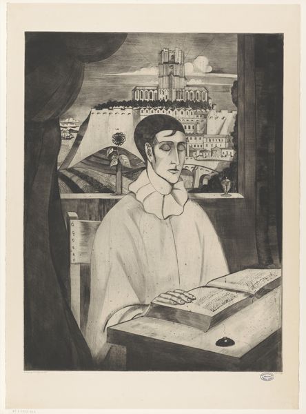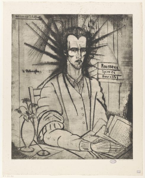 Editor: This drawing, "Filosoof," was made by Lodewijk Schelfhout in 1915. It’s a graphite drawing. I’m struck by how intense the figure's gaze is and the almost fractured background behind him. What symbolic significance do you think the artist might be exploring? Curator: The intensity you observe speaks volumes. The gaze, in portraiture, has always held power. Notice how the geometrical forms surrounding him aren't just background, they're almost cage-like. Is he a prisoner of his own intellect, perhaps? Think of the philosopher as a figure who grapples with truth, sometimes ostracized for it. Do you see any other visual cues supporting this interpretation? Editor: Now that you point it out, the almost skeletal hands holding those papers seem less about knowledge and more about burden. What about the single flower in the vase on the left side of the composition? Curator: Ah, the lone flower! In many traditions, a single flower can represent hope, resilience, or even a fragile life. Considering the prevailing mood, does it feel like a symbol of optimism, or perhaps a poignant reminder of life's transience amidst profound thought? Think of Van Gogh’s sunflowers: vibrancy turned to decay. It introduces complexity, wouldn't you agree? Editor: Definitely. The drawing’s starkness, combined with that one vulnerable flower, adds another layer of meaning. The “philosopher” is burdened by knowledge yet subtly reminded of something much more delicate and vital. Thanks! Curator: Indeed, a dance of contrasts. It reveals how symbols echo across art history. Looking at art like this helps us remember where we came from as a society and where we might be heading, symbolically.