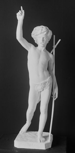 Curator: Isn't this marble sculpture of John Magee Ellsworth, created by Thomas Ball in 1876, just charming? Editor: My first impression is of an incredibly smooth surface and the slightly coy gesture of the boy’s raised hand—almost greeting the viewer, but with a playful hint of modesty. Curator: Modesty definitely plays a role here. Ball sculpted young John, probably around the age of two, holding a drape, a common classical trope referencing idealized innocence and virtue. Editor: The way the fabric clings, almost organically, to his form adds to the composition—see how it defines the weight and the subtle turn of the hip. The craftsmanship on the fabric alone is astounding! Curator: Sculptures like this became fashionable with industrial wealth and patronage from powerful social families. There’s the underlying desire to associate their lineage with this aura of classical idealism. It elevates the child beyond just a simple portrait, making him emblematic. Editor: Right. And notice the base— a classical cylinder. Its presence grounds this young body. We are made to see this sculpture and understand a foundation of power and privilege—though not stated directly. Curator: Absolutely. Consider that during this period, public art gained importance with increased middle-class consumption. Displays like this provided wealthy citizens with an almost instantaneous link between American success and a kind of moral grandeur. Editor: The choice of white marble further emphasizes this idea. White has all the associations of purity and timelessness, doesn't it? It almost creates the feeling that this subject is more idea than mortal boy. Curator: It does add to that sense of almost allegorical significance beyond just representing John. Thank you for focusing on that important nuance. Editor: It’s striking how an apparently simple form invites such complexity.