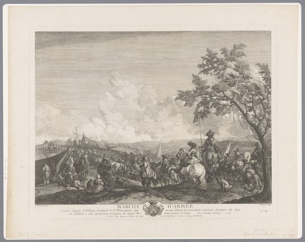 Curator: Jacques Philippe Le Bas created this engraving titled “Rustend jachtgezelschap in een landschap," dating back to 1740. Currently, this print resides at the Rijksmuseum. It seems to depict a resting hunting party in a landscape setting. Editor: It has a serene yet staged quality. The light etching feels almost idyllic, but also distant, somehow. It reminds me of watching a play from very far away. Curator: The composition is really interesting. See how Le Bas has created two distinct groups of people. There's the central grouping of the gentry, almost posed like a family portrait, but then lower down is what appears to be, from the context, the lower-class assistants or workers, including their children. Editor: It reveals a certain hierarchy inherent to leisure. This is Baroque art, so class is really baked into every single image and object from that time, isn't it? I keep returning to the children. Why are they there? And the people resting by what seems to be game birds? Curator: It would likely be unthinkable for the ladies or gentlemen to, say, pluck a pheasant. The lower group supports the upper class’s entertainment, so their presence illustrates the lifestyle as well as indicates something about power relations within society at that moment. Editor: Exactly. The children perhaps hint at inherited positions. The engraving, a copy of another painting most likely, preserves this social theater. Curator: Engravings, in particular, helped to widely circulate images, carrying social messages beyond the elites who could afford paintings. Each symbol and gesture then reinforces a certain vision of society and reinforces class differences as inevitable. Editor: Though a restful hunting party seems harmless, these images cemented roles. The dog, the dead birds...everything becomes a sign of dominion. Thank you, Jacques Philippe Le Bas for unintentionally providing insight into 18th-century societal structures. Curator: A rest stop is rarely just a rest stop.