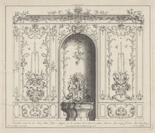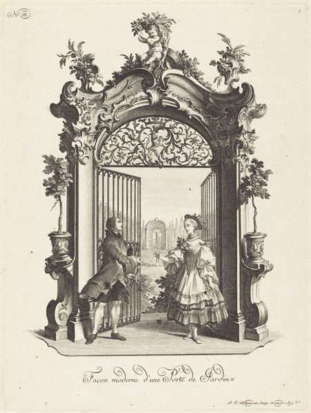 This Rococo design for a door, depicting a woman and a messenger, was created by Johann Esaias Nilson in the 18th century using etching and engraving techniques. Nilson was a master of printmaking, and here he uses the graphic qualities of line to convey the elaborate ornamentation popular at the time. Note the delicate, swirling patterns, the soft gradations of light and shadow. These were achieved through careful manipulation of the etching needle and engraving burin, tools that allowed the artist to incise precise lines into a metal plate. Consider the social context: prints like this were not just artworks, but also a form of design communication. They allowed architects, cabinet-makers, and other craftsmen to circulate and adapt the latest styles. The image becomes a template for skilled labor. This print is a reminder that so-called "fine art" has always been intertwined with the world of design, craft, and the everyday objects that shape our lives.