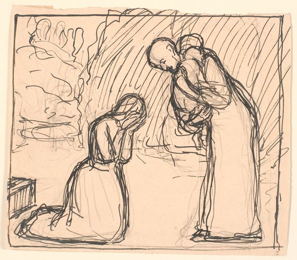 Curator: Fritz Syberg's "Og så gik de ind i Dødens store Drivhus..."—"And Then They Entered the Great Greenhouse of Death..."—created in 1901, offers a fascinating glimpse into the artist's symbolic world, using ink and pen on paper. What’s your immediate reaction to this pen illustration? Editor: Well, first off, I find the composition unsettling. The stark, almost frantic linework, creates a palpable sense of unease. It reminds me of old, lurid fairy tales, where nature itself is a trap. Curator: Precisely. Syberg's handling of the pen is quite remarkable. Notice the varying line weights—the thick, dark outlines defining the figures against the more delicate, scratchy textures that bring forth the surrounding "greenhouse." I find it striking how such simple means convey volume and create a compelling, if rather bleak, atmosphere. It is worth considering Syberg's social milieu, too, the artistic circles around Funen. Editor: Yes, and I'm drawn to the symbolism of the "greenhouse." It feels like a corrupted Eden. The snakes writhing around the figures—they’re the most obvious symbolic markers here, hinting at temptation, deceit, and a loss of innocence. But there is an additional aspect regarding "mother and son" motif. Curator: You are right. And observe the figures, the composition suggests a narrative; that's hard to read, but it has that allegorical sensibility. How do you think Syberg used imagery to convey particular emotions or ideas. Editor: To me, the greenhouse represents a place where death thrives, concealed beneath a veneer of growth and beauty. The snakes, of course, symbolize danger and perhaps the insidious nature of mortality itself, coiled up in something deceptively inviting. Curator: Interesting idea to associate "mortality itself," with snakes. But what are the roots of that relation? It goes back to Adam and Eve. A timeless symbol indeed. In essence, I feel that it is the symbolic space constructed with simple drawing tools and his mastery that make his artwork stand the test of time. Editor: Absolutely. And seeing how the symbols tie into older myths really opens up this piece. It makes the artist's world much richer and the scene more potent and alive in my memory.