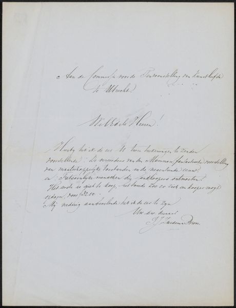 Editor: This is “Brief aan de commissie van de Tentoonstelling van Levende Meesters in Den Haag,” possibly from 1843 or 1844, by Genaro de Perez de Villamil. It’s a pen and ink drawing on paper, essentially a handwritten letter. The letter appears delicate and precise, but what strikes me most is its practical purpose – the labor involved in its creation. How do you interpret its materiality in relation to its function? Curator: As a materialist, I focus on that labor, yes. Think of the materials: paper, ink, the quill or pen itself. These were not mass-produced as we know them today. Their crafting involved skilled labor. But more importantly, the *act* of writing itself was a skilled practice. Consider the time and effort needed to produce legible script – not everyone was literate or possessed such penmanship. Doesn’t that challenge our conventional understanding of “high art”? Editor: Absolutely, it does! So, are you saying the very creation of this letter, its materiality, elevates it beyond a simple note? Curator: Precisely. The letter transcends mere communication; it embodies the social and economic conditions of its making. The paper's quality, the ink's composition, the elegant handwriting – these communicate status, education, and deliberate choices of display through craft. This piece demands we look past the message and consider the production. Is it, in its own way, a tool or commodity in this artist's "production pipeline," if you will? Editor: That’s a fascinating point! I never considered it from a labor-intensive viewpoint. I see the letter differently now; the craft and skills communicate more about the artwork than only what the words say. Thanks! Curator: My pleasure! Thinking about art through the lens of production and materiality opens up new ways to understanding value.