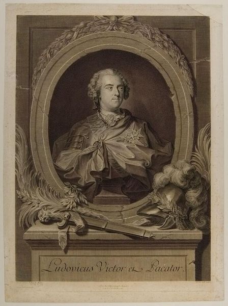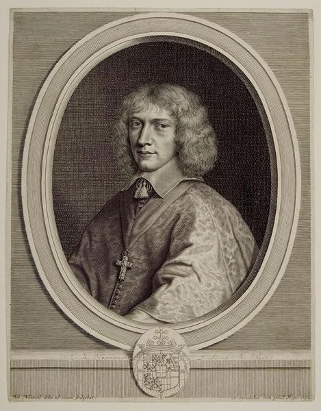 Editor: This is a print of Armand Gaston, Prince de Rohan, by Pierre Drevet. I’m drawn to the formality of the portrait and the way it seems to elevate the subject. What can you tell me about the role of images like this in its time? Curator: This portrait, like many of the period, served a crucial function in constructing and maintaining social hierarchies. The Rohan family's power was deeply intertwined with the Church and the state. How does the visual language—the pose, the clothing, the architectural setting—reinforce this status? Editor: I see that everything from his gaze to the text on the frame emphasizes his importance. It’s all very deliberate. Curator: Exactly. Consider how such imagery shaped public perception and legitimized aristocratic power. Images weren't simply representations; they were active participants in the social and political landscape. Editor: I never thought about portraits as being politically active before. Thanks for broadening my view!