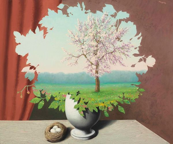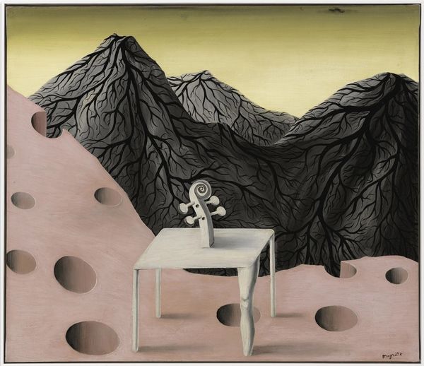 René Magritte created this painting, called L’oasis, during a time of immense social change. The canvas presents a surreal landscape where trees grow from a table in a barren desert, their foliage replaced by clouds. Magritte’s unsettling juxtaposition invites us to question our perception of reality. In post-war Europe, surrealist artists were keen to express the subconscious, tapping into the anxieties and absurdities of modern life. The arid desert setting and the displaced trees may evoke feelings of alienation and environmental concern. It is as if the landscape itself is displaced. The image challenges conventional representations of nature and domesticity. "My painting is visible images which conceal nothing," Magritte once said. "They evoke mystery and, indeed, when one sees one of my pictures, one asks oneself this simple question, 'What does that mean?'". Ultimately, L'oasis encourages us to confront our assumptions about the world, inviting us to find new meanings in the intersection of the ordinary and the strange.