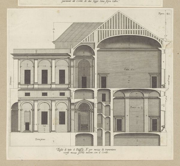 Curator: Here we have "Doorsnede van de Aula Academica in Gent," or "Section of the Academic Hall in Ghent," an engraving dating back to around 1827. The artist, Pierre Jacques Goetghebuer, gives us a fascinating look inside this Neoclassical building. What strikes you most about it? Editor: The austerity of it, I think. The precision and meticulous detail almost erase any sense of human warmth. It feels like an architectural diagram striving for pure rationality. What sociopolitical values does this clarity attempt to embody or even enforce, do you think? Curator: That's an insightful observation. Given its context, it's deeply rooted in the burgeoning bourgeois power of the time, their drive to assert control and order across social strata. The architectural style echoes a return to classical ideals of structure and governance after revolutionary disruption, which had real-world consequences concerning societal power and hierarchy. Editor: Exactly. And that perfectly rendered interior, exposed so plainly? Is there not something carceral about exposing the halls of academia so clearly? The building becomes almost a panopticon. Was this print used propagandistically? Did this supposed realism allow for a fantasy of total and complete social knowledge? Curator: Its realism served the very real ambitions of the elite who sought to control the narratives within those halls. The building as a symbolic vessel, dictating the acceptable discourses of the period. Prints such as these shaped a collective identity—one that embraced a highly idealized and controlled vision of progress. Editor: It's sobering to see how the pursuit of objective truth in architecture, represented by such a meticulous cross-section, can unwittingly or not become a tool to subtly influence power dynamics within institutions. A simple print revealing structural order has deep cultural resonance. Curator: Absolutely, seeing this image helps us recognize how architectural representation goes far beyond mere documentation. It participated in forging an intellectual climate with long-lasting repercussions on who has access to knowledge and on whose terms. Editor: Agreed. The beauty of this seemingly sterile image lies in unveiling a history of power, embedded in stone and ink. Curator: Indeed. A powerful reminder to be critical and to engage art as evidence when trying to build inclusive futures.
