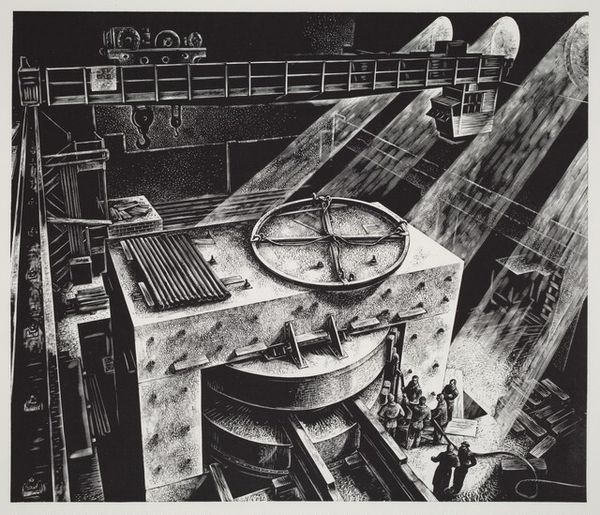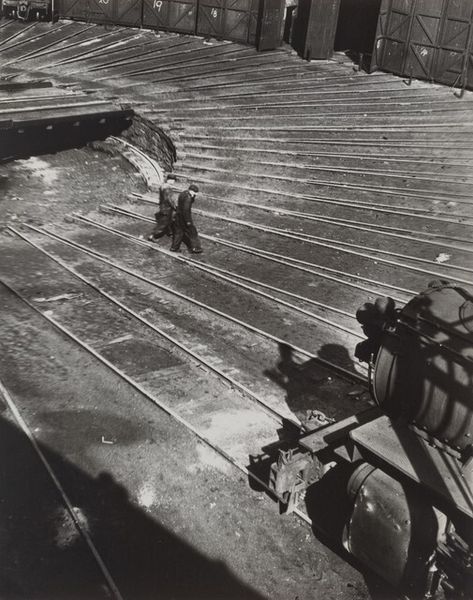 Curator: Paul Strand’s “The Docks, New York,” captured in 1922 using gelatin silver print, presents a striking industrial landscape. What impressions does it conjure for you? Editor: There's an almost eerie stillness to it. A starkness that speaks to the gritty reality of urban labor. It feels... expectant, like a machine waiting to roar to life, or perhaps already silenced after a long shift. Curator: Precisely! The geometric clarity and tonal range are masterfully employed. The composition directs our gaze along intersecting lines, highlighting the interplay of form and shadow. There's a conscious reduction, an essentialization of industrial forms. It’s Modernism embracing the machine aesthetic. Editor: While I agree with your read of form, I wonder, who benefits from this aesthetic? What are the ethics of its presentation? I’m thinking about the daily lives of dockworkers during that time period—labor conditions, socioeconomic disparity. Curator: But doesn’t Strand’s precision offer its own commentary? The very absence of human figures prompts reflection on their labor, their presence implied rather than explicitly depicted. We can also consider how this work typifies straight photography of the time with its use of pure photographic techniques, minimal manipulation. Editor: That “absence” speaks volumes! The focus on structure risks sanitizing a brutal system. Whose stories get silenced? How did this era in New York define and confine immigrant workers, for example? I think the picture, though visually compelling, skirts some important historical questions. Curator: I find that interpretation persuasive. Though one may certainly ponder, does such a formal exercise become less beautiful if born of a troubled milieu? Editor: It changes the context for the viewer. Once we account for its historical position, “The Docks” gains a layer of complexity—a potent and important complication that, for me, doesn't diminish the aesthetic value so much as enrich the conversation around it. Curator: Well, regardless, the work showcases the period’s fascination with industrial subject matter. Editor: Yes, and through your highlighting of form, and my focusing on its political context, the image yields insights that spark vital conversations.