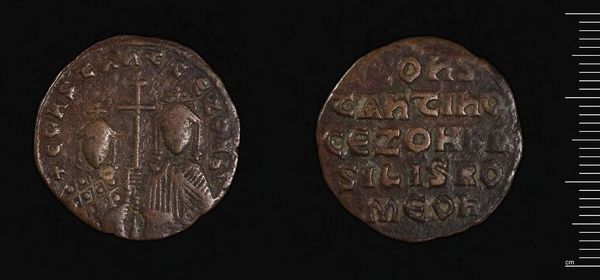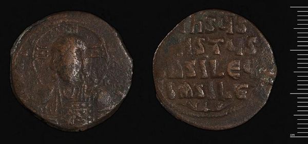 Editor: This is an Anonymous Follis, a coin, and its date is unknown. What strikes me most is how the raised figures and lettering create a tactile experience. What aspects of its formal qualities stand out to you? Curator: Indeed. The circular form, bisected by the images stamped on each side, presents an interesting study in duality. Notice the figure on one side, its halo a perfect complement to the coin's edge. The incised text on the opposite side further emphasizes the interplay between positive and negative space. Editor: That's fascinating. I hadn't considered the spatial relationships so deeply. Curator: The worn texture, too, adds another layer. Does this erosion detract, or does it enhance the coin's visual narrative? Editor: I see your point. It's as if the wear itself is part of the composition. I will consider this further. Thank you.