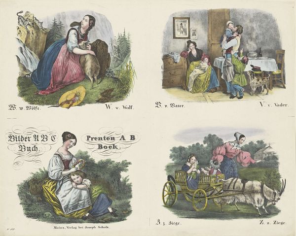 Editor: This print, "Letters W, V en Z" made by firma Joseph Scholz sometime between 1829 and 1880… It reminds me a bit of a children's book illustration, but with a touch of 19th-century Romanticism in its landscapes. What strikes you most about this piece? Curator: What immediately catches my eye is how these seemingly simple scenes reinforce very specific social roles and expectations. Think about it: a woman tending sheep, another caring for children, a father returning home… These images weren't just educational; they were actively shaping perceptions of gender and family during a period of significant social upheaval. Editor: So, it’s not just a charming alphabet book? Curator: Exactly. The landscapes, while seemingly idyllic, subtly reinforce the idea of women's confinement to the domestic sphere, while men occupy a space of authority and providers. We can view the romanticization of the family here as an effort to normalize a particular patriarchal structure and to promote traditional family values at a time when they were being challenged. And what do you make of the fact that the image is presented in both German and, presumably, Dutch? What purpose might that serve? Editor: Interesting. I hadn't considered how the languages might signify a shared set of cultural values they wanted to impart. Curator: Precisely. It invites us to critically examine the power dynamics embedded within these images and their ongoing relevance to discussions about gender, labour, and social constructs. Editor: I never thought an alphabet print could be so complex. It definitely makes me think differently about children's media from that time! Curator: Exactly! It shows how even the simplest artworks can hold rich layers of cultural meaning, and invites us to consider from what perspectives it speaks.