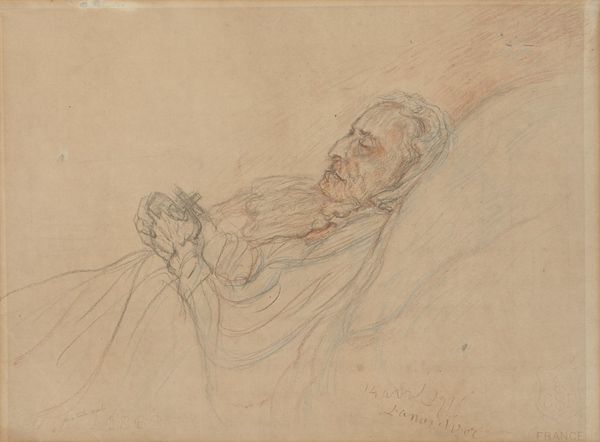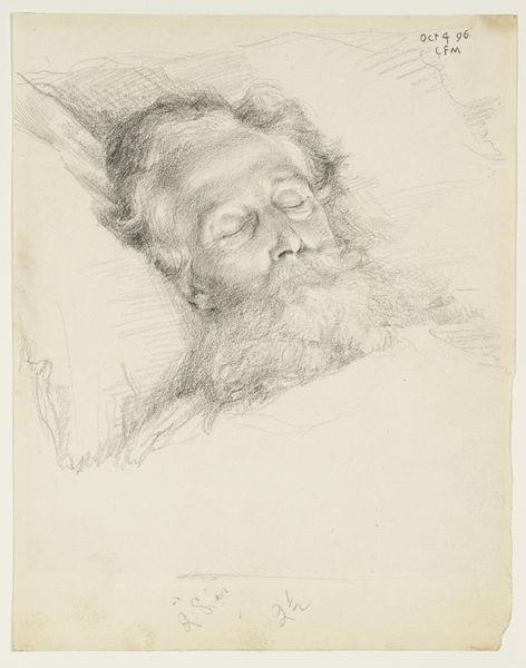 Curator: This drawing, dating from around 1869 to 1925, is titled "Head of an Old Man on his Deathbed" by Antoon Derkinderen. It is crafted with charcoal and pencil. Editor: A stark image. The stark, monochromatic palette and heavy lines evoke a sense of solemnity. The subject appears serene, yet the detail given to his aging face makes it clear that this is no mere slumber. Curator: The choice of medium – charcoal and pencil – is quite fitting. The raw, almost crude texture aligns with the blunt reality of mortality depicted. Derkinderen's approach, focusing on the ephemerality of human existence, invites contemplation about the social attitudes toward death. Editor: Observe how Derkinderen masterfully uses light and shadow to emphasize the contours of the man's face. The chiaroscuro effect creates a sense of depth and draws our gaze towards the finer details. It’s almost sculptural. Consider the textural contrast, too, between the finely rendered hair and beard versus the flatter planes elsewhere. Curator: I am reminded of the late 19th and early 20th-century trend among artists exploring psychological realism, reflecting the working-class experience and concerns about social reform and capturing honest moments in domestic settings. Editor: I appreciate how the lines, despite the sombre tone, flow with ease, lending a remarkable grace to the work. The almost sketch-like quality gives the drawing an immediacy, as if we're witnessing the last fleeting moments of the man’s life unfold. Curator: The artistic skills involved, like how the artist blended materials together, were valued for how clearly an artist can represent real human struggles and societal values during the production and reception. Editor: I was drawn to the rendering of light and texture, which adds a profound sense of poignancy to the scene. This is clearly a deeply evocative visual experience, that showcases a masterful blend of form and content.