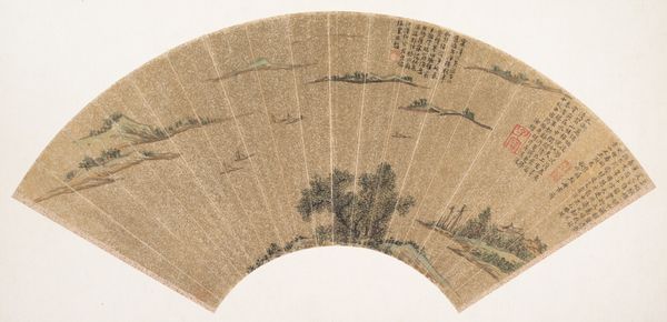 Curator: Here we have Wen Zhi’s "Plum Blossoms," created around 1670. It’s currently held here at the Metropolitan Museum of Art. Editor: There’s something quite fragile about this fan painting. I’m immediately drawn to how delicate the washes of watercolor on paper must be to create that effect of aged ivory and barely-there blooms. Curator: Absolutely, and consider the context of its creation. The late Ming and early Qing dynasties were times of upheaval. Literati artists like Wen often used the plum blossom as a symbol of resilience. Their beauty emerges even in winter's harshest conditions. This artwork subtly reflects societal values of that time. Editor: Yes, that’s fascinating, and it also begs the question: How do the materials contribute to this message? The absorbency of the paper, the fluidity of watercolor— these allow for a certain spontaneity. One can imagine the artist working quickly to capture the ephemeral nature of the blossoms and the season itself. I imagine this would feel precious due to the material costs. Curator: The format itself – a fan – also invites interesting considerations. Fans were both functional and artistic objects, often commissioned and exchanged among the educated elite, further indicating that painting's accessibility in terms of artistry and value within that community. They served not just as adornment but also facilitated social exchanges. Editor: Right, so not merely decorative but imbued with labor and embedded within social relations of use and exchange. We have to imagine the making and its place within that complex historical dynamic of both material and cultural meaning making, especially during turbulent times. Curator: Precisely. Considering that, our reading of its gentle surface evolves. It goes beyond simply portraying pretty blossoms to something charged with significance. Editor: Definitely. It makes me think differently about the embodied energy of creation, you know, a way of considering process to enhance value both culturally and materially. Curator: Indeed. Thank you, these combined insights grant us an enriched perception of the art piece. Editor: Likewise, I leave here admiring this piece's gentle rebellion; what a fascinating contrast!