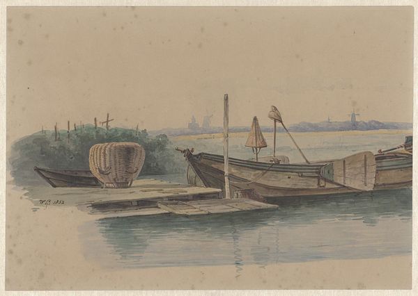 Curator: This watercolor, titled "A Quayside, Barges Being Tarred", is by John Sell Cotman, a British artist born in 1782. It's a wonderfully understated piece. Editor: The muted palette and the sparseness of detail definitely evoke a feeling of quiet industry, almost contemplative. I'm drawn to the geometric interplay of the masts against the softer sky. Curator: The tarring itself is symbolic, wouldn't you agree? A ritual of preservation, extending the life of these working vessels. It connects us to a very tangible past. Editor: Yes, and the tar creates a strong contrast of textures against the worn wood—a study in the materiality of work. The limited color palette unifies the composition very well. Curator: Indeed. And the image is about more than just labor; it’s about connection to place, the relationship between the workers, the boats, and the river that sustains them. Editor: Agreed. The composition, with its deliberate lines and soft washes, creates a balanced but dynamic tension. The figures almost seem secondary to the structures themselves. Curator: Ultimately, I feel this watercolor resonates because it captures a moment in time, a fleeting glimpse into a world that has since faded, yet it remains accessible through this symbolic act of preservation. Editor: For me, it's the careful structuring of simple elements that give it lasting power, a gentle reminder of the beauty inherent in functional forms.