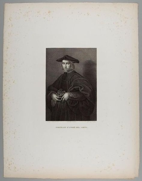 Curator: This is Antonio Perfetti's "Cosimo de'Medici," a plate measuring approximately 33 by 24 centimeters, currently residing at the Harvard Art Museums. Editor: There's a gravitas to it; the subdued palette enhances the subject's somber, reflective mood. Curator: Perfetti's choice of printmaking as a medium is key; prints democratized access to portraiture, allowing wider dissemination of Cosimo's image and solidifying his symbolic role. Editor: The linear precision and careful hatching certainly create a sense of restrained power, almost a psychological study through line and form. Curator: Indeed, consider the social implications. This image circulates, shaping perceptions, reinforcing power structures within Florence. Editor: Ultimately, Perfetti's work invites us to examine the subtle power of visual representation. Curator: A study in how images can shape historical memory, wouldn’t you agree?