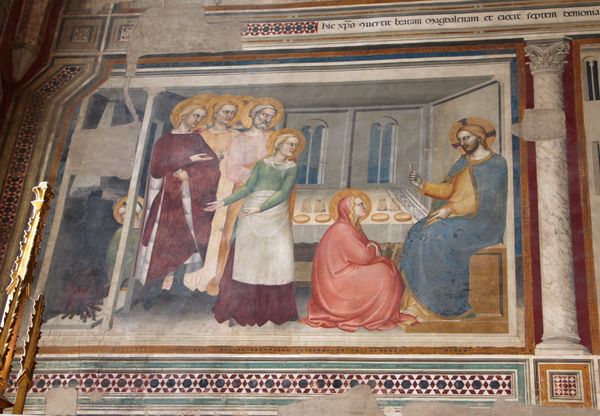 Editor: This is Alessandro Allori's "Stories of St. Jerome," a tempera painting from 1577 in Santa Maria Novella. It has such a fascinating, contained feel to it. I am really struck by how intimate it feels given it's a depiction of an important historical event. What's your take? Curator: Well, what immediately grabs me is the performative aspect of history presented here. Allori isn't just illustrating a scene; he's crafting an image of institutional power. Notice how St. Jerome, likely a portrait of someone influential, is at the painting’s center, surrounded and attended by various figures. Editor: You think he's actually depicting someone contemporary to the artwork? Curator: Very possibly! That wasn't unusual during the Renaissance. And look at the architecture itself – is Allori referencing actual buildings, or creating an ideal of a seat of power and religious significance? How do you think its placement within Santa Maria Novella affects its interpretation? Editor: Interesting question. Knowing it’s in a church adds a layer of religious context, but it also might comment on the Church's political role during the Renaissance. Curator: Exactly! Allori uses a style often described as Mannerism. Do you think this is the peak of Mannerism's cultural influence, or perhaps does this appear at a time when its innovations are being subsumed? Consider how the artificiality and exaggeration of form might have played in Florence's political climate, so soon after the High Renaissance. Editor: I never thought about connecting style and politics so directly, but it makes perfect sense. Now I see this as less about St. Jerome as an individual and more about how power is constructed and visualized. Thank you for expanding my understanding of the piece and that era. Curator: Likewise! Exploring those connections can really deepen our engagement with Renaissance art.