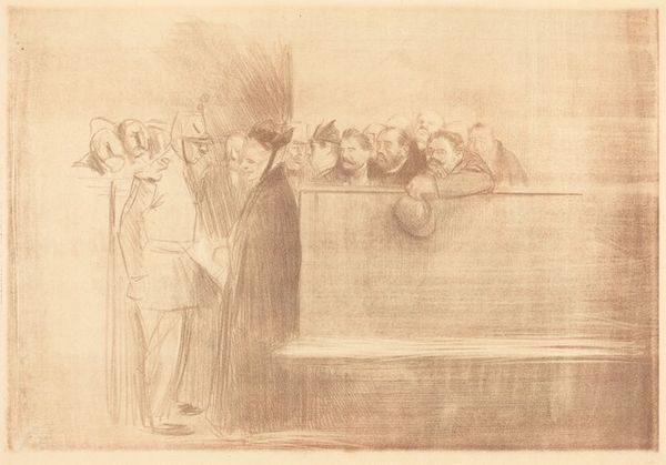 Charles Samuel Keene made this ink drawing, Force of Habit, using the simplest of means: pen on paper. The immediacy of the medium allowed Keene to capture a scene of everyday life with remarkable efficiency. The strokes of the pen create a sense of depth and texture, from the cross-hatching that defines the speaker's coat to the quick, confident lines suggesting the faces in the crowd. Keene was known for his work in popular publications like "Punch," and this drawing reflects that background. It's a scene of labor, with a speaker addressing a crowd, perhaps in a courtroom or public meeting. The quick, almost journalistic style speaks to the demands of producing images for mass consumption. The drawing isn’t about refined artistry. Rather, it emphasizes capturing a moment, a social dynamic, with the speed and precision that the printing press required. Ultimately, appreciating the material and social context of "Force of Habit" helps us see it not just as a drawing, but as a product of its time, deeply embedded in the world of work and visual communication.