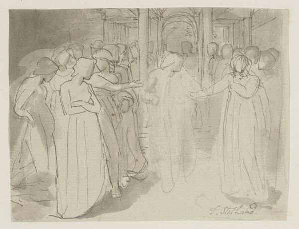 Otto Scholderer created this watercolor sketch of a high society gathering sometime in the mid-19th century. Scholderer lived during a time of significant social change, with the rise of industrialization and shifting class structures, factors that undeniably influenced his artistic perspectives. In this sketch, we see an assembly of figures, primarily women in elaborate dresses, juxtaposed against men in more somber attire. The ambiguity in their interactions hints at the complexities of social dynamics within this group, while the emphasis on attire and social posture speaks volumes about the importance of appearance and status. While Scholderer captured the scene, the sketch invites us to consider the experiences of those who may have been excluded from such gatherings. What unspoken rules and expectations governed behavior within this society? How did race and gender shape opportunities and interactions? With quick strokes, Scholderer provides a glimpse into the dynamics of a society defined by its rigid social structures.