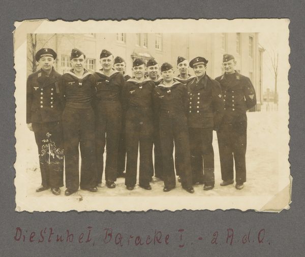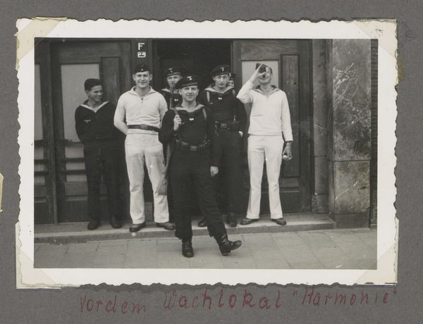 Editor: So, here we have "Five Sailors in a Park," a gelatin silver print from around 1940-1943, currently housed in the Rijksmuseum. It strikes me as both incredibly ordinary and deeply poignant. I mean, it's just a snapshot, right? But, given the historical context, I can’t help but feel a kind of underlying melancholy. What do you read into it? Curator: It does hum with that bittersweetness, doesn't it? It feels suspended between youthful camaraderie and the heavy cloak of wartime uncertainty. I am drawn in by the realism, and I imagine each sailor with unique stories, captured in this stolen, mundane moment. What about the monochrome adds, do you think? Editor: Well, the black and white definitely adds to that sense of distance and formality, but it also throws into relief details of the park...but also makes the scene feels a bit bleak and lonely. But who made it and what was the impetus for such photograph during this period? Curator: That is hard to know since the Artist is recorded as anonymous. Considering the war period during which it was captured, maybe these Sailors wanted to portray what normalcy meant in the world turned upside down. Also, it is important to reflect the gaze of an anonymous person into the gaze of unknown young naval men. What a double reflection in such intense, poignant times. So much left unsaid, wouldn’t you agree? Editor: Absolutely. It’s like a quiet testament, a whisper from the past. It certainly leaves one to wonder about what became of these men after this photograph was taken, a reflection, to what they really wanted. Curator: An excellent perspective that gives rise to further investigation.