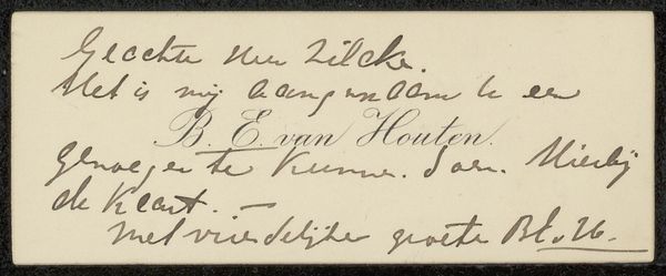 This is a business card to Jan Veth, created by Max Liebermann. It’s all handwriting, elegant, in a dark, almost charcoal-like ink. The letters are so carefully done, with a slight variation in thickness and pressure, it's like a dance across the card. You know, I always find the most seemingly casual marks can sometimes reveal the most about an artist’s thinking. The card itself has a slightly rough texture. Each stroke seems deliberate yet spontaneous, like a carefully choreographed improvisation. Look at the 'M' in Max. It's more than just a letter; it's a little abstract painting. This reminds me of Cy Twombly's scribbles, or even some of Hanne Darboven's systematic writing. There is a sense of time, and layering, even in a single business card, like art is always in conversation.