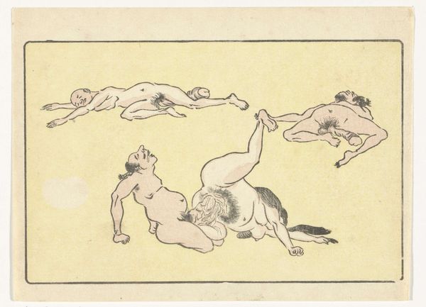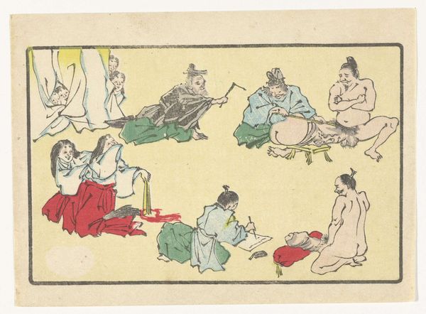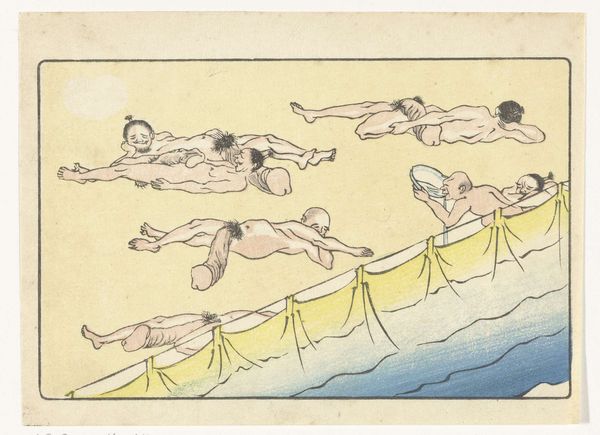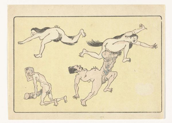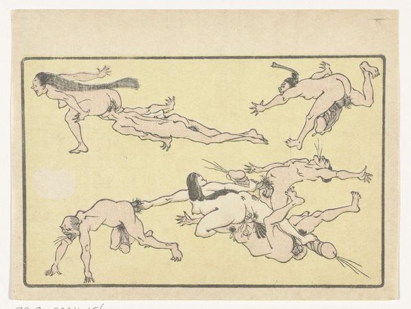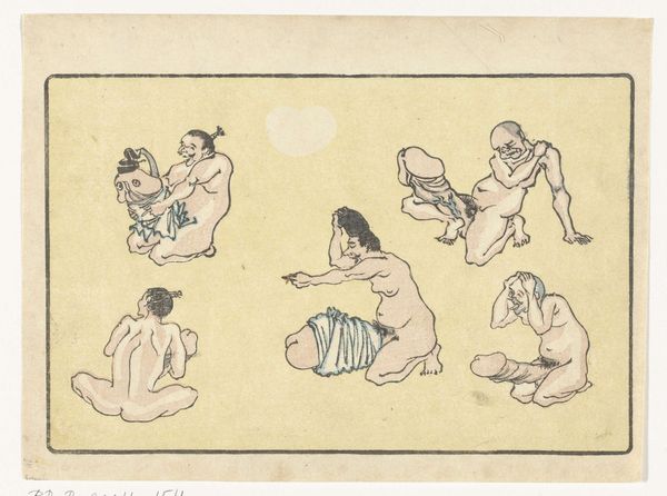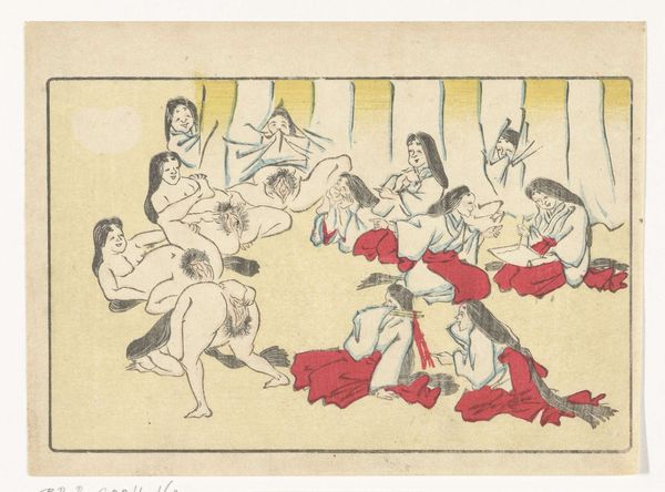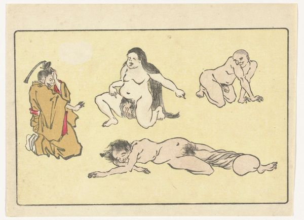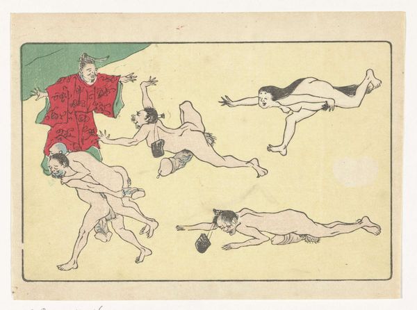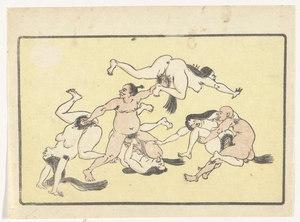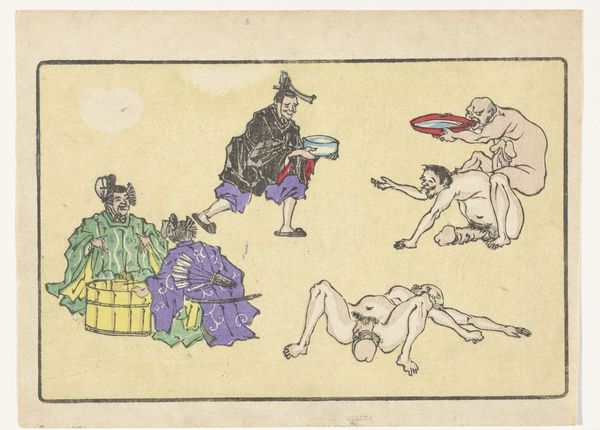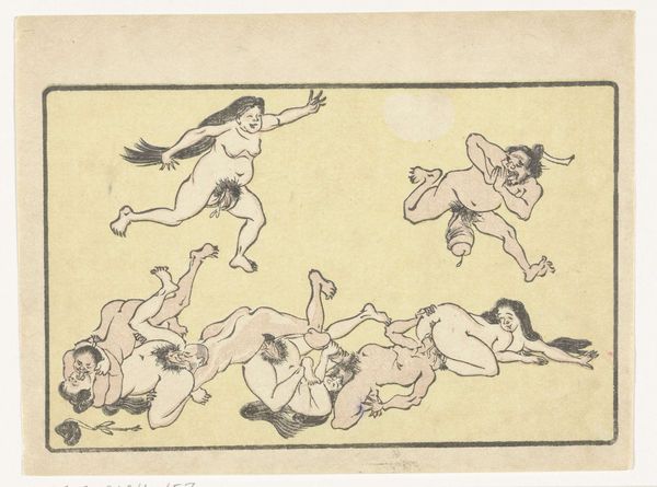 Editor: So, this is Kawanabe Kyōsai's "Gong," a woodblock print from around the 1870s or 80s. The energy just jumps out at you, it’s a really playful, almost chaotic composition. What's your take on it? Curator: It's a fantastic example of Kyōsai’s skill in visual storytelling and caricature. What strikes me most is how he uses symbolic representation to convey layers of meaning. What do you notice about the figures themselves? Do any particular elements catch your eye? Editor: Well, they seem like mythical creatures or demons…the exaggerated features, the nakedness...and the way they’re all sort of piling on top of each other. It feels both comical and slightly unsettling. Curator: Exactly! Kyōsai draws heavily on Japanese folklore and Shinto beliefs. These aren't just random figures; they likely represent yokai, supernatural entities, each embodying different aspects of human nature. The gong itself…what significance do you think that holds? Editor: Is it a reference to announcing something or heralding something about to come? Curator: It can also symbolise a moment of intense sensory overload – joy, chaos, release, and perhaps even a warning depending on context. Also remember, this was made during the Meiji Restoration, a time of massive cultural change, how do you think Kyōsai, comments on these traditions of imagery from a country going through extreme modernisation? Editor: I guess this explains the clash of tradition and a bit of satirical fun, which you might easily find within a ukiyo-e piece from that period. Curator: Precisely, by studying his imagery we can decode elements of shared social norms and ideals with visual motifs. The print really provides insight on an intersection of psychology, society and personal insight. Editor: I definitely see how digging into the symbolism unlocks new depths. It’s more than just a funny picture; it’s a window into a whole cultural world. Curator: Indeed! The "Gong" showcases how images preserve the cultural memories we associate to periods in art.
