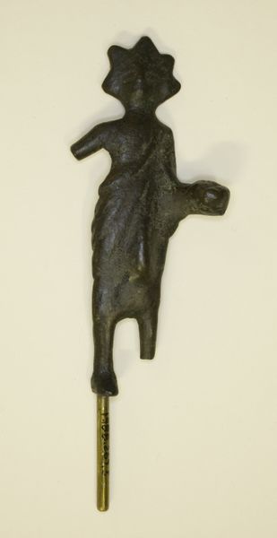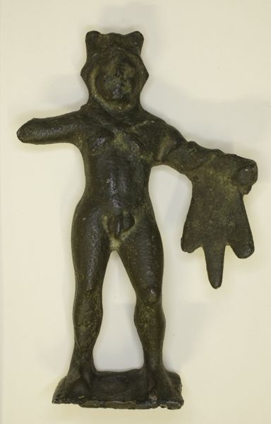 Editor: This is an image of a marble sculpture included in Luigi Palma di Cesnola's "A Descriptive Atlas of the Cesnola Collection of Cypriote Antiquities," published between 1885 and 1903. It depicts a standing male figure, slightly damaged. The figure is holding a mace, and has archaic features. I'm immediately struck by the way the figure exudes power but also vulnerability, perhaps due to its age and damage. What do you make of this? Curator: Well, firstly, consider the mace. Throughout history, the mace has often served as a symbol of authority and power. Now, note its slightly damaged state – what cultural memory does this invoke, reflecting on the nature of power? How stable or vulnerable are systems of rule represented through a figure like this? Editor: So, the sculpture and its degradation speak to something beyond just a single ruler. Curator: Precisely. Think about Cyprus, its location as a crossroads between empires. This figure, and perhaps even its incompleteness, becomes a potent symbol of cultural exchange, resilience, but also the fragility of cultures in the face of larger forces. Editor: It’s interesting how one object can contain so many overlapping narratives. It makes you wonder about the sculptor and their intended message, or whether the object was meant for something entirely different. Curator: Indeed. We must allow for layers of intention and meaning-making over time. Every line, every break, every element echoes through time. Consider this - what does the act of documenting it within an atlas add? Does it freeze it in time, or open it up to more stories? Editor: I’m now viewing this atlas, this sculpture, not just as one archaeological item, but as a symbol with so many cultural connections. Curator: Excellent! The more we look, the more that gets unlocked.