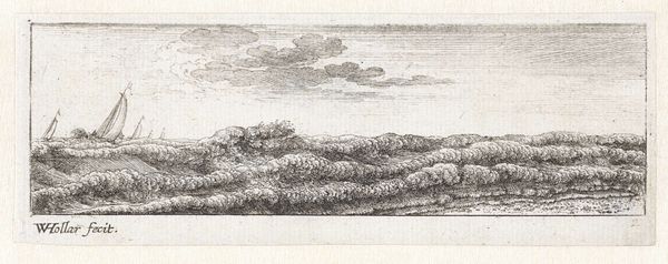 Wenceslaus Hollar created this etching of "Duinen bij Naarden" with ink on paper, immortalizing the dunes near Naarden. Born in Prague, Hollar's life was shaped by the tumultuous times of the Thirty Years' War. His personal experiences as a refugee likely influenced his artistic perspective, leading him to capture the serene yet melancholic essence of the Dutch landscape. In this piece, the seemingly endless dunes evoke a sense of isolation. Yet, the distant figures and ships hint at human activity, suggesting a world beyond. Hollar navigates the tension between the natural world and human presence. Consider how Hollar uses the etching technique to create texture and depth, inviting viewers to contemplate their place within the vastness of the landscape. This artwork serves as a reminder of the interconnectedness of personal experience, historical context, and artistic expression.