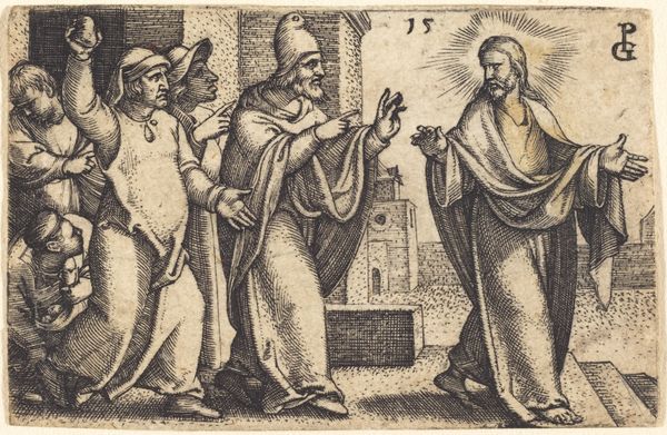 Hans Baldung created this woodcut, titled "Marquard von Lindau ask and answer the Ten Commandments" where the figures dominate the frame, their robes and gestures rendered with fine, deliberate lines. The interplay of light and shadow, achieved through dense hatching, gives a sense of depth. The composition, structured around the seated figure of Lindau, suggests a hierarchy of knowledge and power. Baldung uses line to define not just the forms but also the emotional and intellectual space between the figures. This connects to wider questions around faith, authority, and the individual’s quest for understanding during the Reformation. Each line serves as a signifier, contributing to a semiotic structure that invites us to interpret the relationships and moral questions at play. Notice the intricate details like the horse and dog which might denote loyalty and status. Consider how each element invites us into a world where the visual and the symbolic intersect. It prompts us to question the nature of faith, knowledge, and representation itself.
