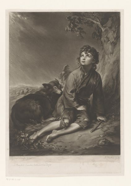 Curator: Ah, yes, "Lepralijder," or "Leper," by Alexander Ver Huell, created around 1865. It's a print, an etching in fact, and you can find it here at the Rijksmuseum. What’s your first impression? Editor: Despair. A really profound sense of loneliness and resignation. The man looks utterly dejected, slumped against what looks like a crumbling wall. Curator: The title, of course, gives us a clue. Leprosy was, at the time, a deeply stigmatized disease, often leading to social isolation. The interesting thing about Ver Huell's work is how he addresses these social outcasts. Editor: You can almost feel that weight of isolation, can’t you? He’s literally cast aside, positioned at the edge of everything. Notice those two figures dancing in the background—are they aware of his existence at all? It speaks volumes about the indifference of society. Curator: It does, doesn't it? There's a theatricality, too. This Romantic sensibility is really at work here. He almost invites a sense of pity in a classical style, inviting the viewer to contemplate themes of exclusion. Ver Huell seemed keen to represent figures pushed to society's margins. Editor: The composition definitely heightens the emotional impact. The figure dominates the foreground. But even though he’s physically closer to us, he seems worlds away. That light pencil work also has an incredible effect. Curator: It gives everything an ethereal quality, doesn’t it? Leprosy also carried heavy moral connotations then. These prints could serve a public function, shaping societal responses to the sick. Editor: Art as a vehicle for social commentary and hopefully empathy. It really reminds you how powerful images can be when challenging collective thinking, isn’t it? Curator: Precisely! I always come back to this artwork, contemplating just how effective this kind of art can be. It serves not only as a piece of history, but also a piece that reflects contemporary views.