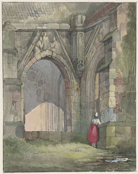 Curator: What strikes me first is this wash of melancholy. A watercolor, quite small, attributed to the British School, showing a ruined abbey. Editor: Ruined, yes, but somehow also reclaiming itself. Look at the figures in the foreground, almost like the land is welcoming them back, or has it always been theirs? Curator: It's evocative, isn't it? The crumbling arches, the wildflowers pushing through. A romantic ruin, a testament to time. Editor: Absolutely. But who got to write that romantic narrative? The ownership, the dispossession inherent in these landscapes—it's all swirling beneath the surface. It echoes through time. Curator: A somber note on a scene that, at first glance, seems so picturesque. Editor: Exactly. It forces us to consider not just what we see, but what histories are embedded within.