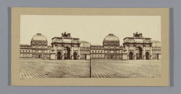 Curator: Right, let's have a look at this rather fascinating albumen print. It's titled 'Gezicht op de Kathedraal van de Maria-Tenhemelopneming te Palermo', or a view of the Cathedral of the Assumption of Mary in Palermo, dating back to sometime between 1862 and 1876, and it's attributed to Jean Andrieu. Editor: What strikes me immediately is its stillness—an almost eerie calm for such a grand structure. The tones are so muted, sepia-soaked nearly, it’s like looking at a forgotten dream. Curator: I agree, there is an atmosphere of stillness about the photographic composition. Andrieu, primarily a photographer, has rendered this architectural colossus, famed for its hybrid architectural styles that incorporate gothic, Moorish, and Norman elements, in meticulous detail. We can consider the light and shadow—the way it articulates volume—it creates strong linear elements guiding our eye around and throughout the photographic frame. Editor: Indeed, it’s a structured observation, yet somehow I feel the hand of history has intervened here more than the photographer's objective. It’s so wonderfully and formally laid out. Look how the foreground shadows introduce a quiet melancholy and how that large dome feels rather alien above the stonework. I would call it quite successful formally even without accounting for what it might want to represent! It’s an evocative rather than informative artwork, at least for me. Curator: I understand that; it doesn’t necessarily have a narrative drive, but its effect as documentation or simply memory are profound—we cannot mistake how clearly these lines allow for the transmission of visual information even today. It truly does seem to suspend us outside of time, somehow. It is still affecting me. Editor: Yes, now you’re beginning to capture the magic for me. I see the image almost like a found object, filled with accident and a latent surrealism, almost like an antique stage set from a play. Thank you for walking me through this interesting work.