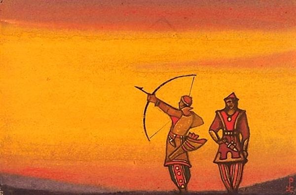 Curator: Nicholas Roerich's oil painting, "Tombs in the Desert," created in 1930, offers a study in landscape and symbolism. Editor: It hits you, doesn't it? Just this immediate, almost breathless silence. Makes you think of ancient whispers. Curator: The composition is striking. Note the stark contrast between the warm earth tones and the cooler, ethereal sky. Roerich uses color to create a sense of depth and distance. Editor: Right, that almost blinding sky—it's not a welcoming expanse, more like a silent judgement. And the figures, these dark silhouettes, feel burdened, weighed down by the very ground they stand on. Curator: The stylized rendering, a hallmark of modernism infused with realism, simplifies forms, focusing on their essential geometries, and those simplified shapes lend an almost mythical quality to this scene. Consider too Roerich's well known theosophical inclinations, evident in his deployment of symbolism. Editor: It's that combination though, isn’t it? That simplicity mixed with the weight of history or loss. What stories are buried with these figures? Where are they going or from what place did they flee? I can't help imagining entire narratives within these brushstrokes. Curator: I agree. His work is charged with potential meanings. I see it as a study of the sublime—the delicate balance between humanity's small place in the grandeur of the cosmos and the weight of civilization. Editor: Sublimity... exactly! This small canvas isn't just depicting tombs; it’s burying hopes and futures too. Maybe this vision echoes those ancient lamentations that we all feel now in our shared, anxious, present? Curator: A potent interpretation, certainly. Roerich invites each viewer into contemplative experience of stark, existential space. Editor: Beautiful, yes. Ultimately Roerich's vision reminds me how tiny we are in time and place. Powerful, that.