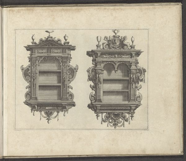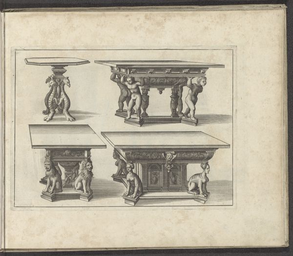 This detailed engraving titled, "Vier tafels, gestapeld" or "Four tables, stacked" shows designs for elaborate wooden tables, crafted sometime in the early modern period. It is not just the design of the tables that is of interest, but also the labor and class implications embedded within the image. The tables showcase complex joinery, turning, and carving; all skills that would have required extensive training. It is safe to say that these tables would have been exclusive to the wealthy. The level of detailing would have been a display of their wealth and status. The artist's intention to highlight the value of skilled labor, contrasts with the modern tendency to devalue craft. It's a reminder that the objects we surround ourselves with are often the result of immense creative investment, and reflect the social and economic conditions of their time.