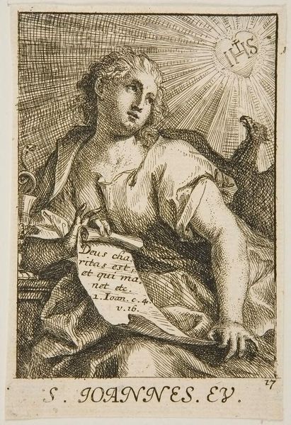Editor: This is Domenico Cunego's "Sibylla Amalthea." I'm struck by the textures. The fabric seems almost tangible, contrasting with the smooth skin. What production methods allowed for such detail? Curator: Consider the labor involved in printmaking at this time. The artist's skill directly translates into economic value. The intricate lines weren't just aesthetic choices, but a demonstration of craftsmanship, a form of material capital. Editor: So, the act of creating the image is a form of labor, and the details showcase that labor? Curator: Precisely. And who could afford such crafted items? The text at the bottom hints at the patron's social standing, further emphasizing the relationship between art and its economic context. Editor: I hadn't thought about that before. I see it now. Curator: Material conditions shape artistic production and reception. Editor: That’s a very interesting perspective. Thanks for your help.