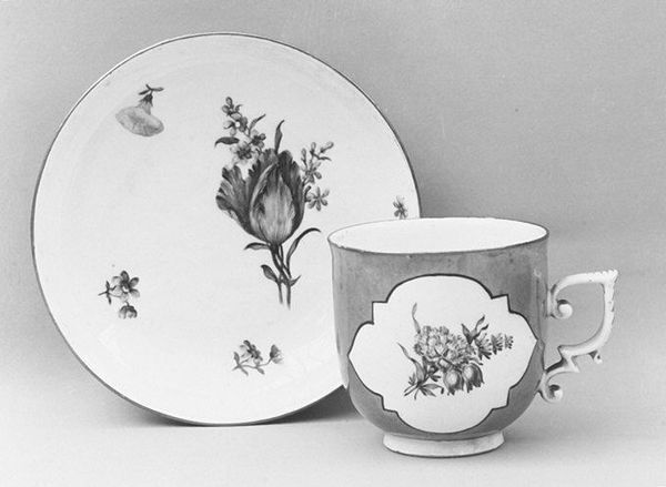 Editor: So, here we have a delicate porcelain cup and saucer made by the Doccia Porcelain Manufactory between 1785 and 1799. It feels so fragile and restrained. How can we begin to interpret its historical role? Curator: Well, considering the era, think about what porcelain represented socially. This wasn't just a cup; it was a signifier of wealth, taste, and participation in global trade networks. Porcelain from the East was incredibly coveted. To have your own manufactory in Europe creating similar wares allowed participation in power structures and access to exclusive commodities. Editor: It's interesting to consider the imagery of the flowers, too. Was that purely decorative or symbolic? Curator: Highly symbolic! Floral motifs in the 18th century weren't random. Each flower could represent certain virtues, social standing, even political alliances. Who consumed from these porcelains and how might its floral symbolism reinforce their identity and position within society? And what was its market within the evolving aesthetics and economic contexts of the time? Was it challenging prevailing styles, appealing to emerging consumer preferences, or reaffirming tradition? Editor: I hadn't really considered how loaded everyday objects could be! So, this simple cup and saucer speak volumes about global trade, wealth, taste, and social position at the time? Curator: Exactly! It highlights how material culture shapes and reflects historical power dynamics, something we often overlook. We assign great power to the paintings and monumental artworks in museums but forget the agency that domestic items can also have. Editor: Fascinating. I’ll definitely see everyday objects differently now. Thanks for widening my perspective.