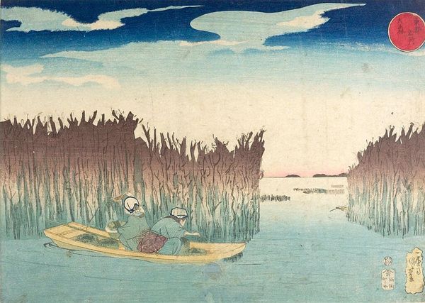 Curator: This is Utagawa Kuniyoshi's "Åmori, from the series Famous Places in the Eastern Capital." Kuniyoshi, active in the 19th century, captured everyday life in Edo—now Tokyo. Editor: It feels like a scene from a dream, doesn't it? The light is so soft, and those reeds loom like ancient guardians. Curator: Indeed. Kuniyoshi's work provides insight into the social hierarchy and cultural values of the era, even in seemingly simple landscapes. Consider the figures in the boat; their posture, clothing. Editor: They're just drifting along, part of the scenery. Makes you wonder what they're thinking, what stories they carry with them. It’s funny how a simple scene can feel so complex. Curator: Precisely. Kuniyoshi offers us a glimpse into their lived experience, hinting at the broader currents of Edo society. Editor: I like how the moon, or is it the sun?, watches over them. Like a silent witness. It really places us in that moment, in their little boat, surrounded by whispering reeds. Curator: The beauty is how Kuniyoshi makes us consider the specific within the universal. Editor: Beautiful. It's like catching a memory in a bottle.
