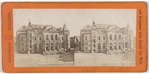 This is a photographic stereoview of the façade of the Kaiserin-Elisabeth-Bahnhof in Linz, captured by Aimé Civiale. The sepia tones and the stereoscopic format give the image a sense of depth and historical distance. The composition emphasizes symmetry and architectural structure. The building's façade is divided into distinct sections, with repeating arched entrances and evenly spaced windows, creating a grid-like pattern. The towers on either side further reinforce this sense of balance and order. This emphasis on structure invites a semiotic reading, where the architectural elements function as signs of stability and modernity. The rigid arrangement suggests a controlled, rational space, characteristic of industrial-era functionalism. Consider how the formal qualities of the photograph—its clear lines and balanced composition—not only document the architecture but also convey the values of the period. This image is more than a mere record; it's a structured representation imbued with cultural and philosophical implications.