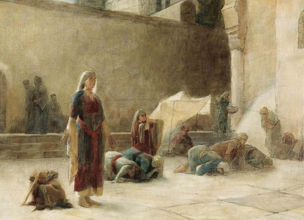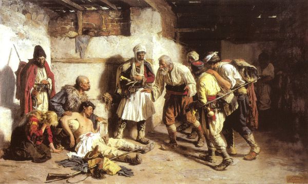 Theodoros Ralli created this painting, called 'The Captive' with oil on canvas. The work immediately strikes you with its strong contrast, a spatial tension between shadow and light. The background reveals a religious scene with Byzantine-style figures painted on the wall, while the foreground shows a scene of captivity. We can read the semiotic tension between the religious icons and the Ottoman presence. The captive woman in traditional Greek dress, stands in stark contrast to the men lounging amid weaponry and loot. Ralli's use of light and shadow divides the painting, suggesting a clash between cultures and religions. Here, the artist engages with themes of power, identity, and the representation of cultural conflict. The composition destabilizes our perception of the scene. It doesn't offer a clear viewpoint but uses contrasting elements to raise questions about cultural and historical narratives. It leaves us contemplating the complex relationship between identity, religion, and power.