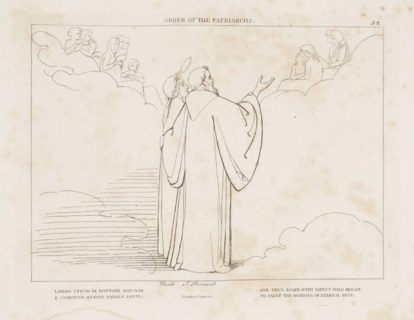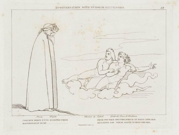 Editor: John Flaxman's "Purification from Envy," a drawing residing in the Tate Collections, presents a scene with figures on clouds and below on earth. It feels like a depiction of moral cleansing, but what do you see in this piece? Curator: It's compelling to consider this work through a lens of social hierarchies. The figures aloft, seemingly weightless and free, contrast sharply with those below, bound to the earth. Do you see parallels in contemporary society? Editor: I hadn't thought of it that way. It makes me consider the concept of "purity" and who gets to define it. Curator: Exactly. The very notion of purification can be a tool of oppression, used to exclude and marginalize those deemed "impure." It prompts us to question power dynamics. Editor: That's a powerful interpretation. It makes me realize that art can be both beautiful and a reflection of societal inequalities.
