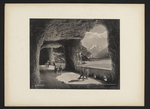 Curator: Let’s turn our attention to this gelatin silver print from the late 19th century, “Parti ved halvtunnellen I Bratlandsdalen, Suldal, Noorwegen,” attributed to Knud Knudsen. Editor: It immediately evokes a feeling of awe. The sheer scale of the rock formation dwarfs the road and suggests a path carved through nature's immensity. It’s very much in the tradition of the sublime. Curator: Indeed. Structurally, the composition plays with contrasts—light and shadow, the smooth curve of the tunnel versus the jagged rock face. Note how Knudsen frames the opening to create a strong vanishing point, drawing the eye deeper into the scene. Editor: The tunnel itself is compelling as a symbol. Throughout history, caves and tunnels represent transitions, thresholds into the unknown. And it seems charged with a sense of foreboding—a vulnerability, given the weight of the rock above. Curator: Knudsen’s tonal range in this print, given the early technology of photography, is quite sophisticated. Observe the gradations in the rocks' surfaces, which suggest volume. The photograph certainly speaks to the photographer’s technical control. Editor: And yet, there’s a starkness to the image. Consider the choice to include such prominent rocks around the image. This draws your eye immediately into an inescapable composition where civilization makes slow progress, as symbolized by that barely traveled road, which is constantly vulnerable under the rough contours of nature. Curator: The placement of the trees on the right softens this effect a bit; their organic, unfurling forms create a contrasting element, don't you think? It lightens the tonality to make a smoother composition. Editor: I agree. In total, Knudsen offers us not merely a landscape, but a statement about the complex interplay of human will and natural forces. The constant balance creates tension throughout. Curator: Absolutely. It shows just how fruitful it is to bring together our different perspectives. Editor: A true interplay.
