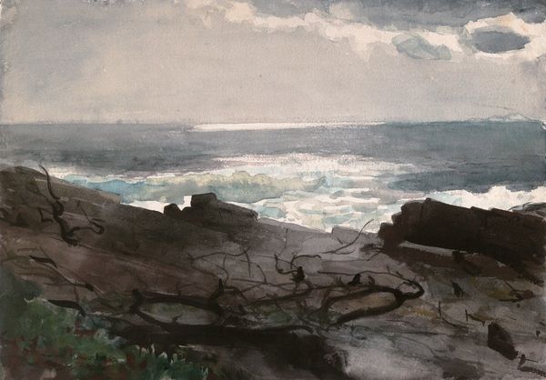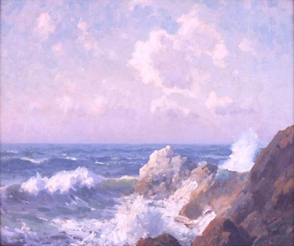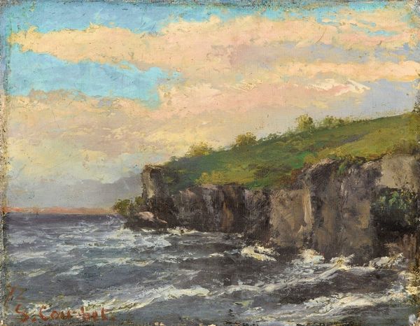 Curator: Jean-François Millet’s "Les falaises de Gréville," painted between 1871 and 1872. Look at how the oil paint captures the cliffs overlooking the sea. It’s like a hushed stage before the storm. Editor: I see a quiet intensity—that churning sea with foamy white caps hints at power. I almost feel the dampness in the air, and the rough texture of the rocks against my hand. It is an invitation to reflection. Curator: Indeed, it reflects a transition in Millet's work, leaning toward the impressionistic but still firmly rooted in realism. I mean, this region held a significant emotional weight for him, as it's where he spent his childhood. Think about that childhood shaping his view. Editor: The rocks themselves could be read as steadfast sentinels of time, each one carrying stories of weathering and endurance. There’s almost a primal energy, that pull between earth and water, mirrored in the sky. Curator: Right, the landscape seems to function as a repository of memory and the infinite nature that surpasses individual lifetimes. Even the sky feels symbolic, pregnant with both potential and passing. Editor: I keep being drawn back to the water... that mesmerizing shimmer pulls me towards contemplating its connection to unconsciousness. Perhaps the water’s surface mirroring a dream. Curator: It also speaks to the relationship between Millet and his environment, with the post-impressionist nuances acting as almost direct sensory translations. A translation of the feelings. Editor: Perhaps this is why its lasting effect feels familiar...it is the elemental struggle of existence transformed into visual metaphor. In the end, these cliffs aren't just a location, they become symbols for our human condition. Curator: Absolutely, "Les falaises de Gréville" is about remembering, feeling, and representing through material a lasting moment that, while gone in life, is immortalized in art. Editor: What is interesting to me, is its almost archetypical significance--enduring cliffs meet wild sea. A painting pregnant with meaning that still manages to be so quietly personal.