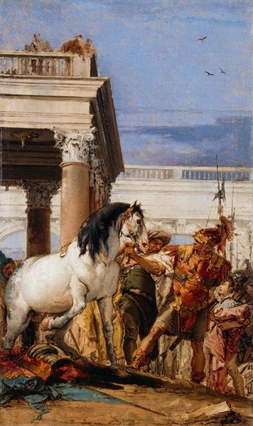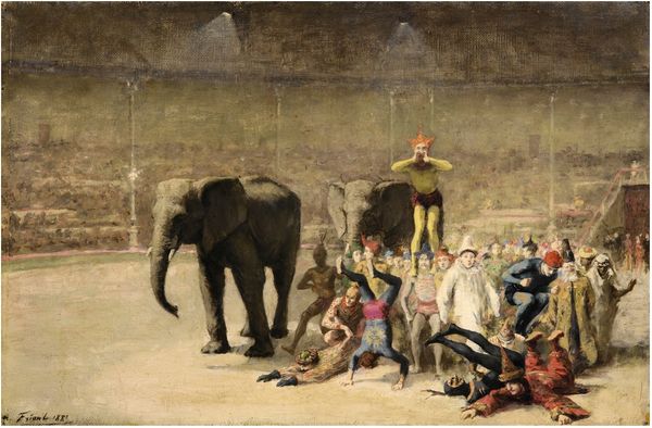 Editor: This is Jean-Léon Gérôme’s 1883 oil painting, "The Christian Martyr's Last Prayer." It feels incredibly staged, almost theatrical. I'm struck by the composition, how it's divided, with the Christians on one side and the lions about to be released on the other. What do you make of this division, and of the artist's choices overall? Curator: The division, precisely rendered through formal compositional strategies, speaks volumes. Note the rigid lines of the architecture framing the arena, counterposed with the fluid, almost yielding posture of the Christians. The geometric precision with which Gérôme constructs the scene – the near perfect circle of the coliseum, bisected by implied lines of force emanating from the lions’ den – underscores the brutality inherent in the spectacle. What strikes me, even more, is how light articulates this separation, emphasizing shadow on the left and exposing forms bathed in light on the right. Editor: So the contrasting use of light isn't just aesthetic; it is also communicating meaning, showing vulnerability. Curator: Indeed. And consider how the arrangement and color contribute. The multitude of spectators form a blurry sea of nondescript colors, while in stark contrast the artist depicts the Christians in sharp focus. Editor: That does shift the visual emphasis onto the group awaiting their fate. What else about the composition stands out to you? Curator: Observe the lions; they become an active component with respect to color and posture that contribute significantly. Note their position within the immediate foreground, heightening the imminence of their presence with the victims, who in turn form their own cluster near the painting’s center. Do you see how those arrangements draw our eyes towards a particular space in the scene? Editor: Absolutely. I hadn't noticed the lion in the foreground. All of these things have provided a completely different reading than the historical reading. Thank you. Curator: My pleasure. Looking closely can unveil layers unseen at first glance.
