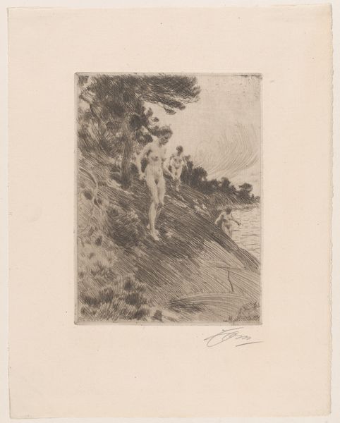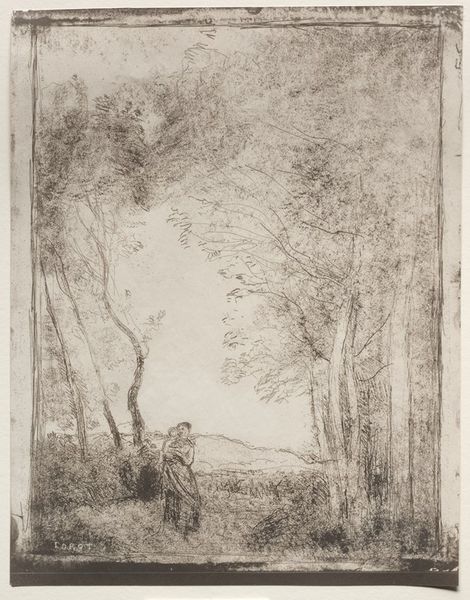 This is Odilon Redon's etching, David, which is now at the Art Institute of Chicago. Executed in a monochromatic palette, the print captures a biblical scene with stark simplicity. The composition is dominated by dense, dark lines that coalesce to form figures and foliage, set against the stark white of the paper, intensifying the drama. Redon's technique, particularly in his use of aquatint, creates a dreamlike quality, emphasizing the emotional rather than the literal. The image's structure invites a semiotic reading, where elements like the severed head and the act of holding it up become potent symbols. The lack of clarity challenges traditional notions of representation, pushing beyond the purely visual. The emphasis on form and texture over detail is a hallmark of Redon's symbolic approach. This destabilizes established meanings, inviting a deeply personal and imaginative engagement. This approach challenges fixed meanings and highlights the fluidity of interpretation.
